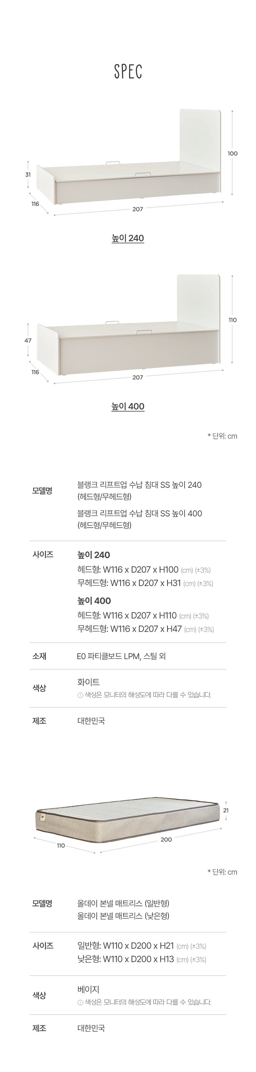 | 품명 | 포더홈 블랭크 E0 리프트업 수납침대 (매트선택) | ||